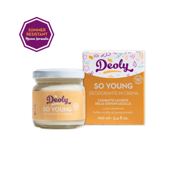 So Young di Deoly è il deodorante in crema per le pelli più giovani. Efficace e a lunga durata, è indicato per i ragazzi a partire dalla pubertà, che hanno bisogno di particolare delicatezza e protezione. A base di soli ingredienti naturali, altamente traspiranti, come bicarbonato di sodio, caolino e amido di riso, non altera la sudorazione fisiologica e garantisce un’azione antiodorante persistente. Profumazione di avocado e cetriolo unisex ideale sia per ragazzi che ragazze.